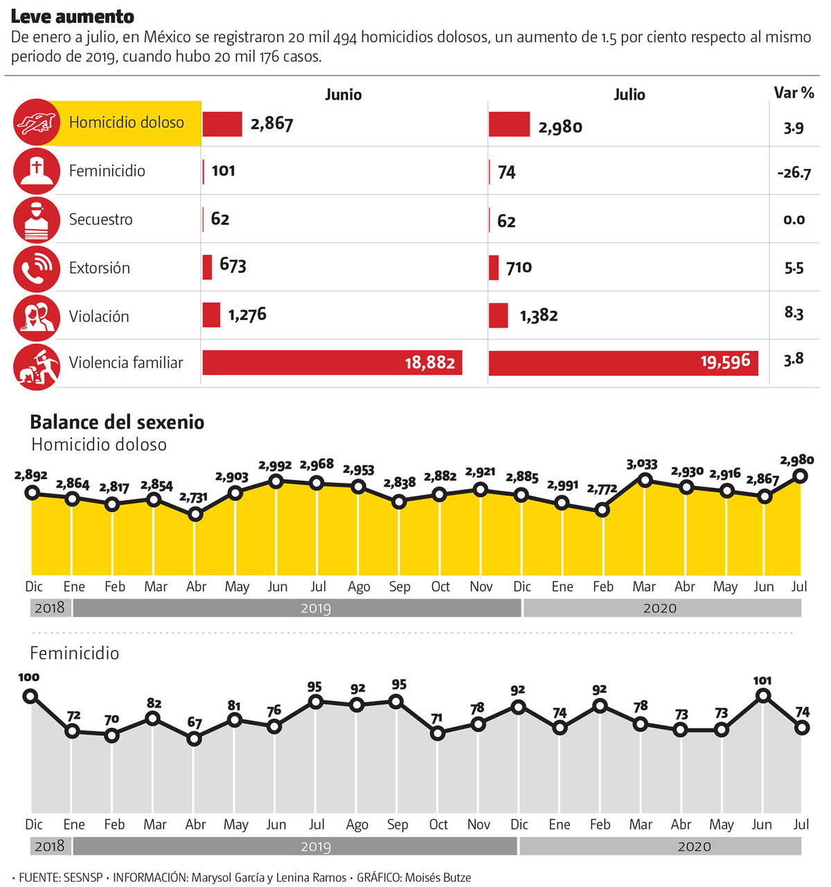 De los delitos que reporta el SESNSP, los únicos que mostraron una baja fueron los feminicidios, con 74 víctimas en julio frente a las 101 de junio, y la trata de personas, con un aumento de 13 carpetas de investigación.