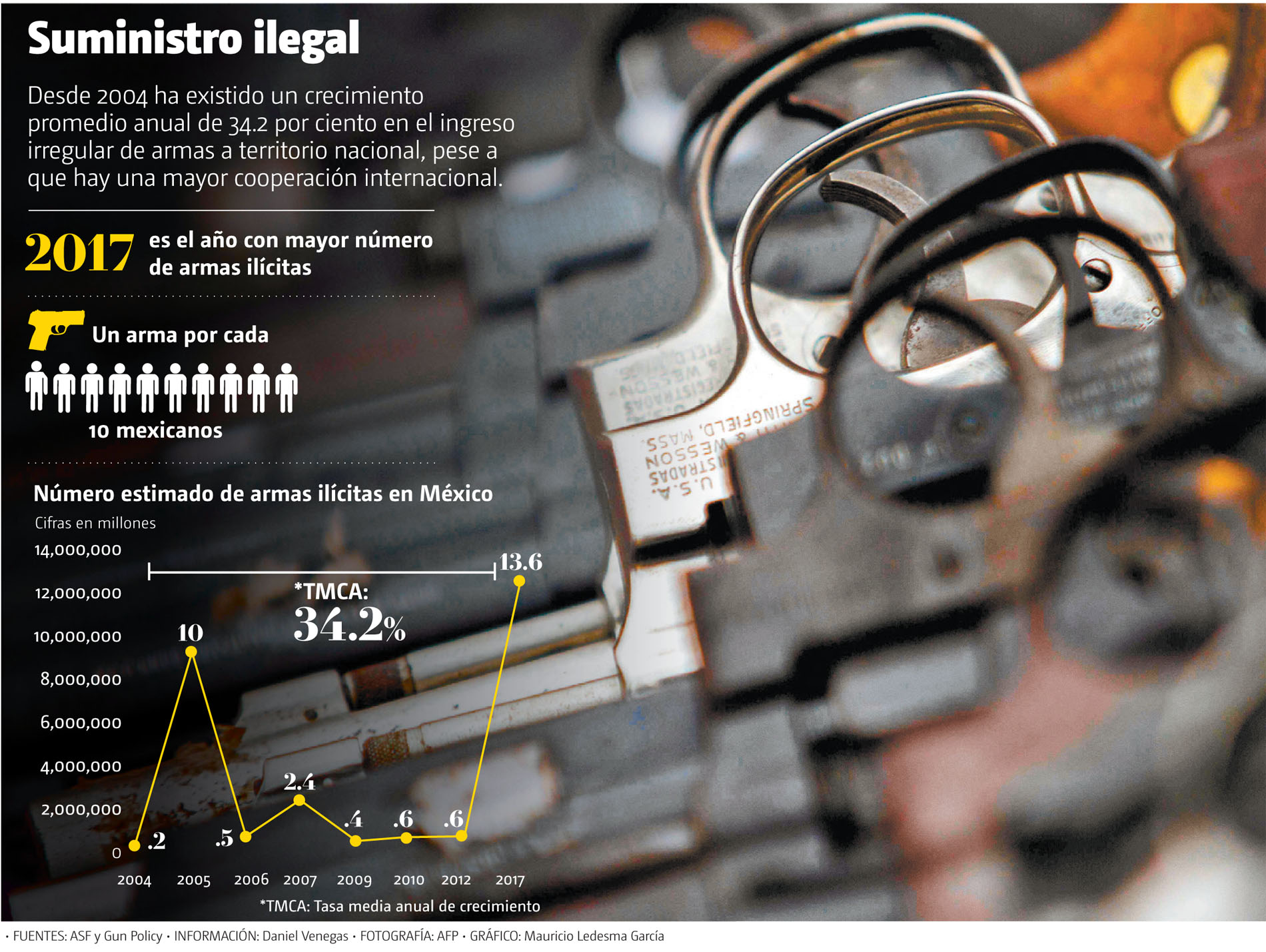 En México existen 13 millones de armas ilícitas, lo que equivale a una por cada 10 mexicanos, de acuerdo con las cifras contenidas en una auditoría de la Cuenta Pública 2017 sobre el cumplimiento de convenios internacionales en materia de seguridad, que cita como referencia a la organización Gun Policy.