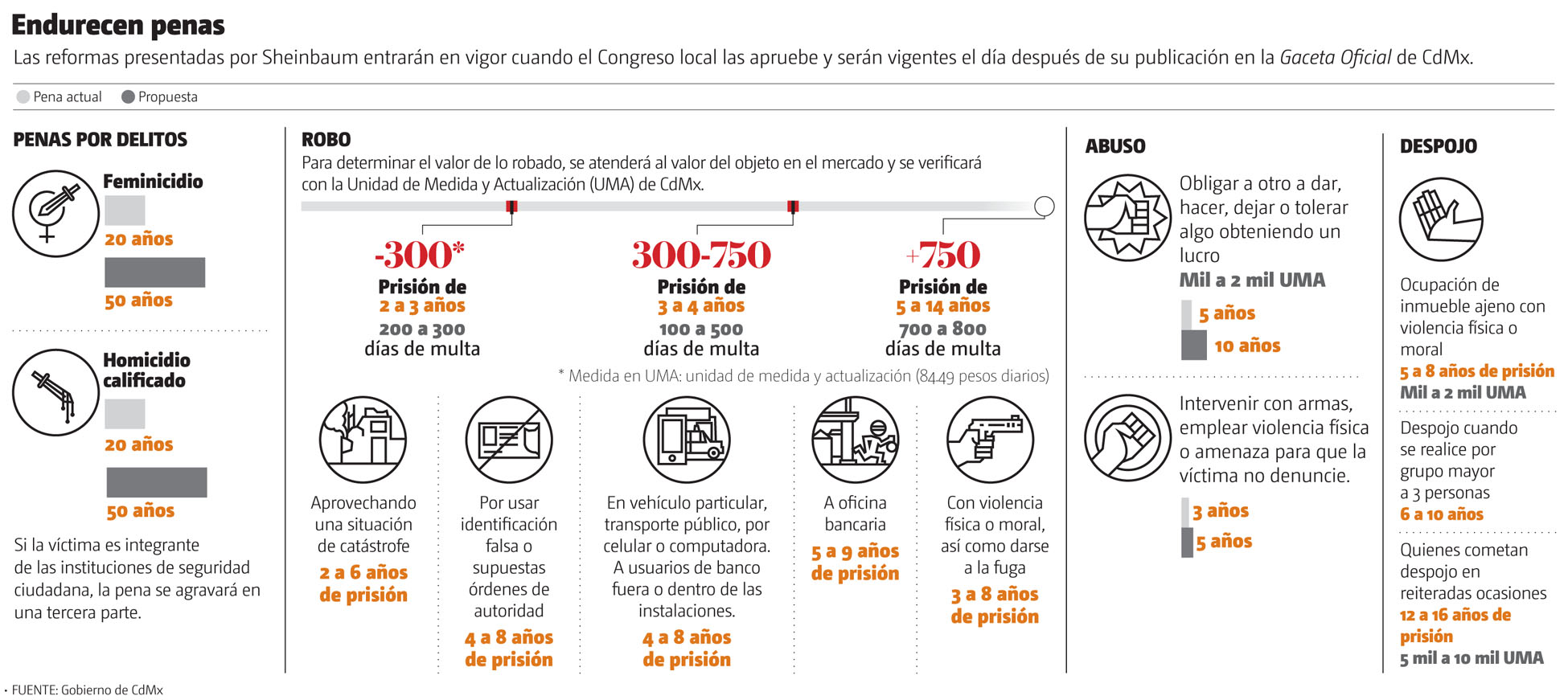 Con el endurecimiento de penas que van de 20 a 50 años de prisión para feminicidio y homicidio calificado; de cinco a 14 años, por apoderarse de una cosa mueble, y de cuatro a ocho años por robo de celular, es como la jefa de Gobierno, Claudia Sheinbaum, busca disminuir los índices delictivos en Ciudad de México.