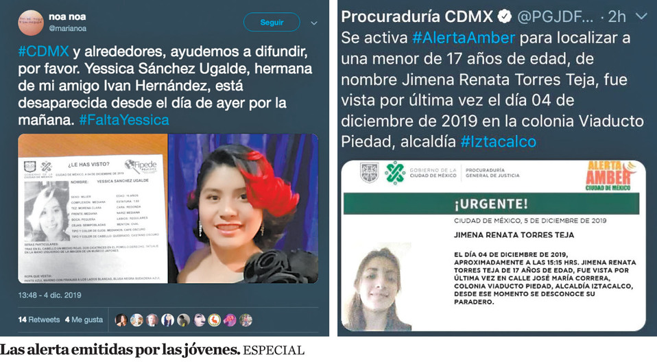 Al mismo tiempo, familiares de Yessica Sánchez Ugalde, de 16 años, reportaron en redes sociales la desaparición de la adolescente en la colonia Axotla, en Álvaro Obregón; según la ficha de búsqueda girada por la procuraduría capitalina, se desconoce su paradero desde el 3 de diciembre.