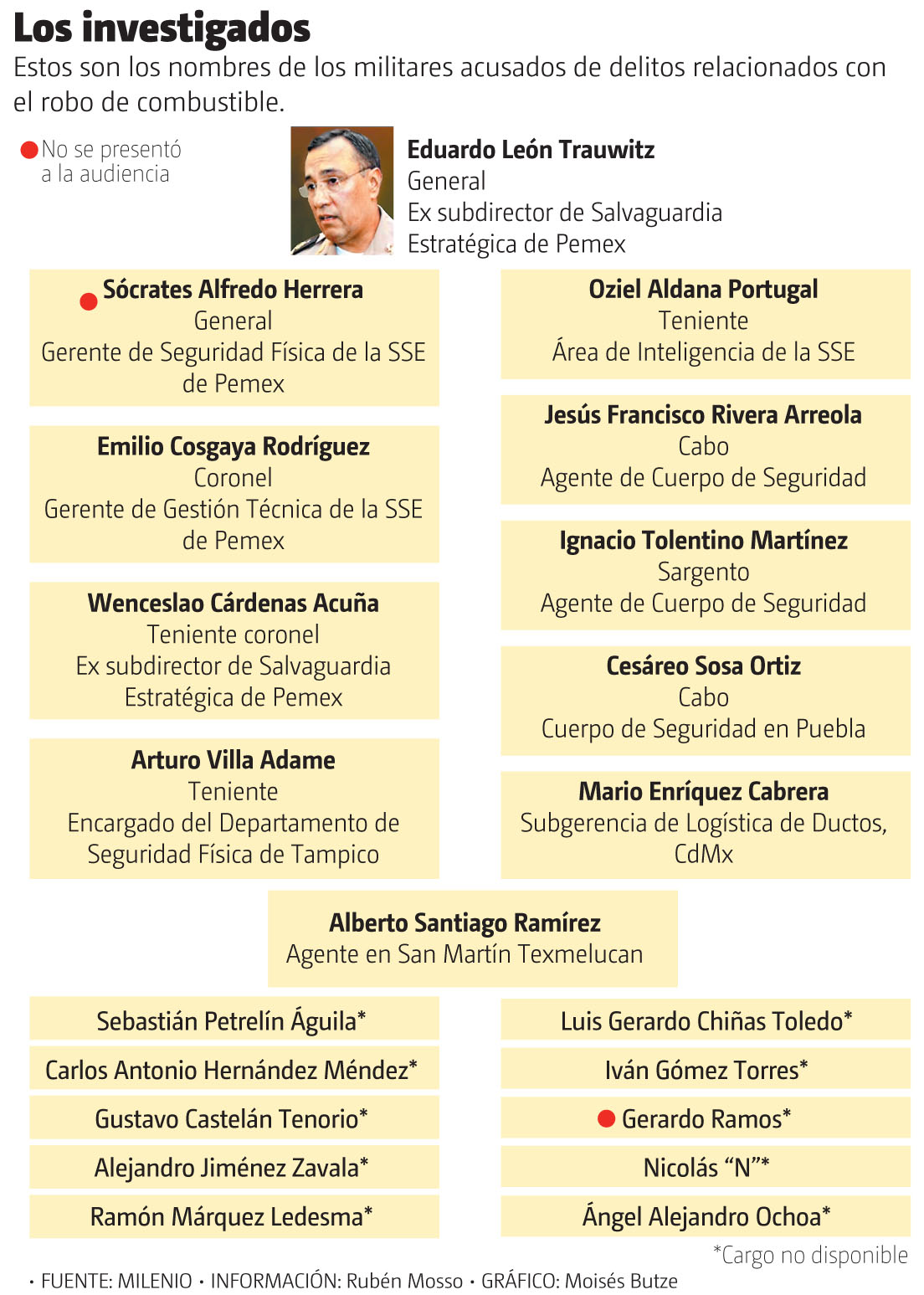 Diecinueve militares encabezados por el general Eduardo León Trauwitz, ex titular de la Subdirección de Salvaguardia Estratégica (SSE) de Petróleos Mexicanos, se presentaron ante una juez federal en calidad de imputados, porque la Fiscalía General de la República (FGR) los acusó de delitos relacionados con el robo de combustible.