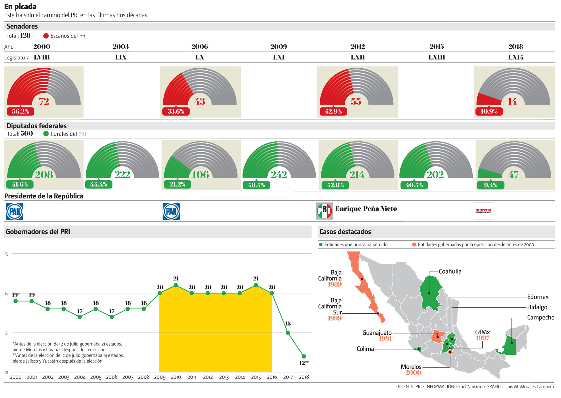 El Partido Revolucionario Institucional (PRI) ha perdido 80 por ciento de su representatividad en el Congreso en las dos veces que ha entregado la Presidencia a la oposición, mientras en los últimos 18 años también ha cedido siete gubernaturas, al pasar de 19 a 12, es decir, 37 por ciento.