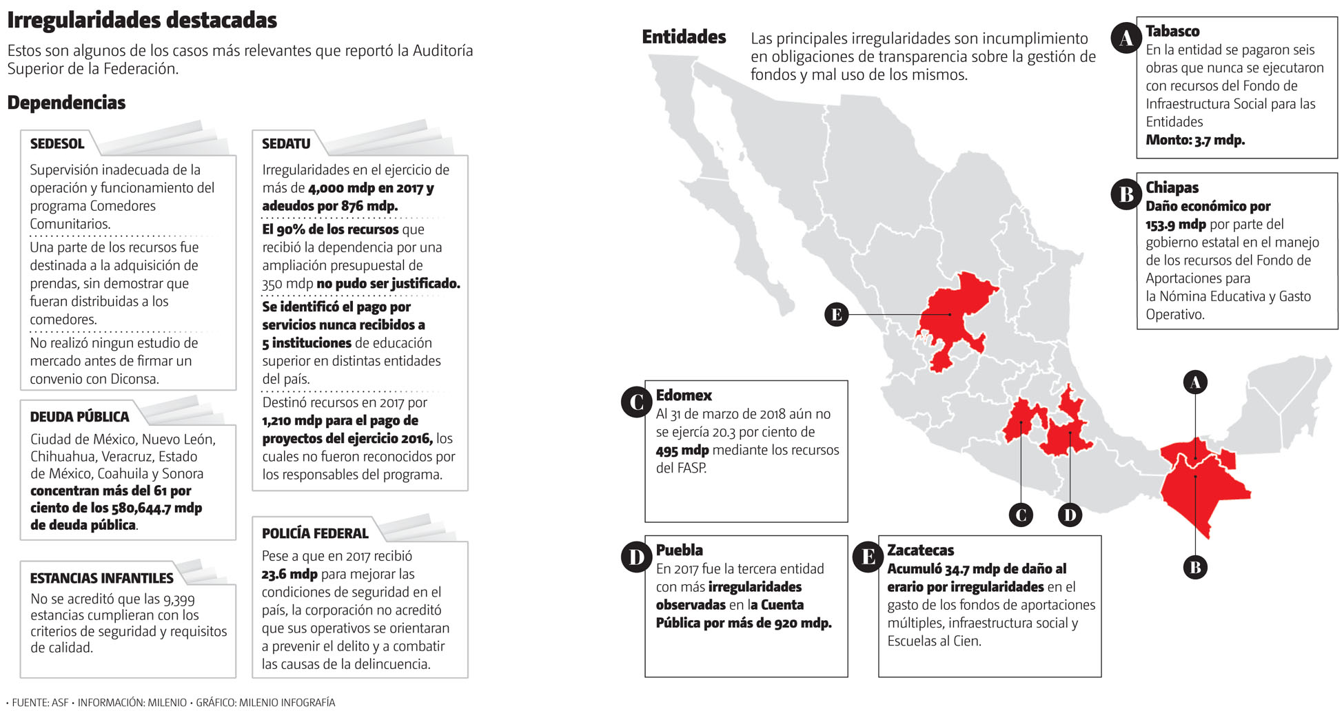 La Auditoría Superior de la Federación (ASF) documentó irregularidades por un monto de 68 mil 136 millones de pesos pendientes de aclarar por entidades del gobierno federal, estados y municipios respecto al ejercicio presupuestal de 2017.