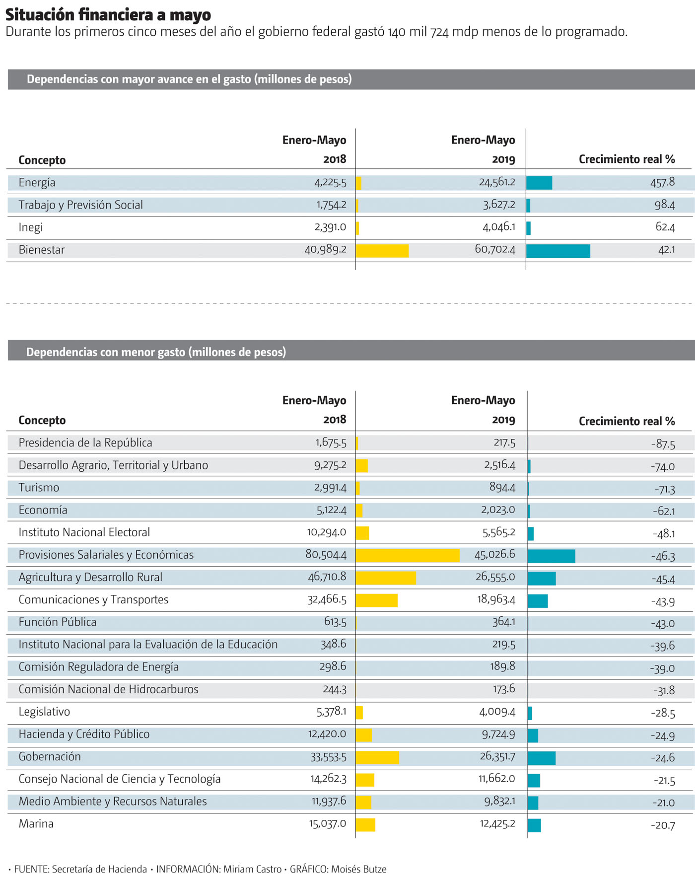 En conjunto, representan la cuarta parte de los más de 140 mil millones de pesos. No obstante, en comparación con el periodo enero-mayo de 2018, tuvieron avances de 5 y 6.4 por ciento. Pemex erogó 31 mil 568 millones de pesos menos.