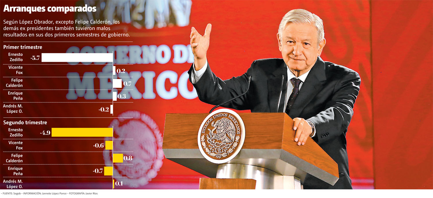 “Plantean que es el peor trimestre en 10 años; miren, les voy a mostrar, no con el afán de contradecir, sino de aclarar. El primero y el segundo trimestre de Zedillo, -5.7 y -4.9 por ciento, y no sé por qué, a lo mejor porque rescató a algunos y convirtió las deudas privadas en pública, tiene aceptación hasta de buen economista.