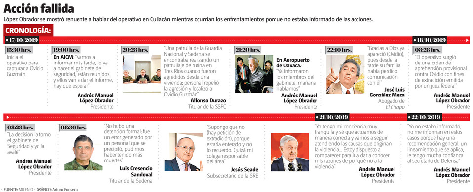 El presidente Andrés Manuel López Obrador afirmó que él no estaba enterado del operativo que se montó el jueves pasado en Culiacán, Sinaloa, para capturar a Ovidio Guzmán López, hijo de Joaquín El Chapo Guzmán, pero dijo que, aunque fue interrumpido por la reacción violenta de los miembros del cártel de Sinaloa y la liberación del presunto delincuente, el objetivo de aprehenderlo sigue en pie.