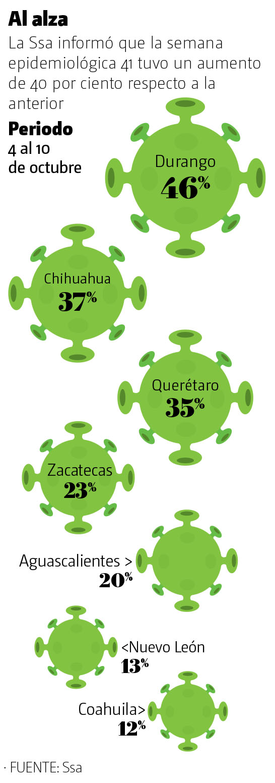 Su homólogo de Zacatecas, Alejandro Tello, informó que el estado pasó de 456 contagios en la cuarta semana de septiembre a 990 en la tercera de octubre, un promedio de 90 diarios.