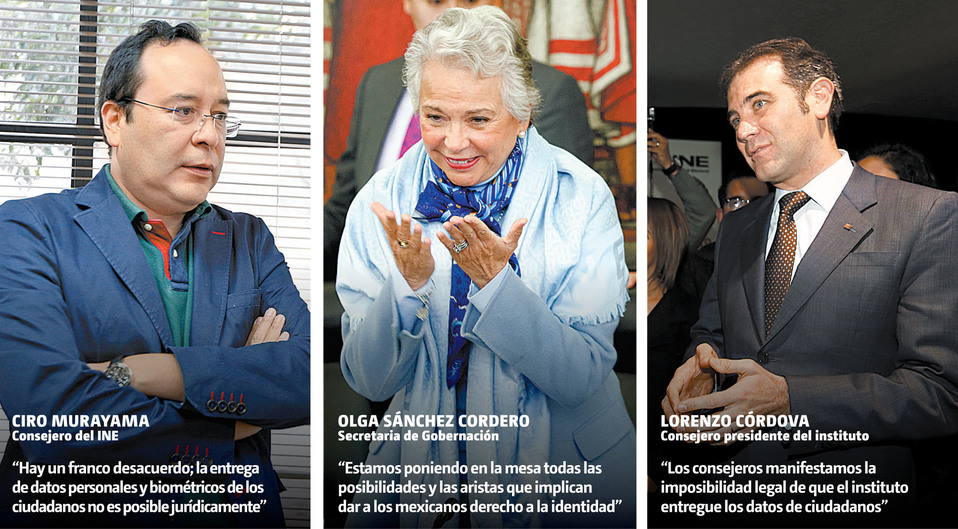 Los consejeros del INE rechazaron entregar a la Secretaría de Gobernación datos biométricos de los mexicanos inscritos en el padrón electoral para crear una cédula de identidad. Ayer acudieron a la dependencia a un encuentro con Olga Sánchez Cordero.