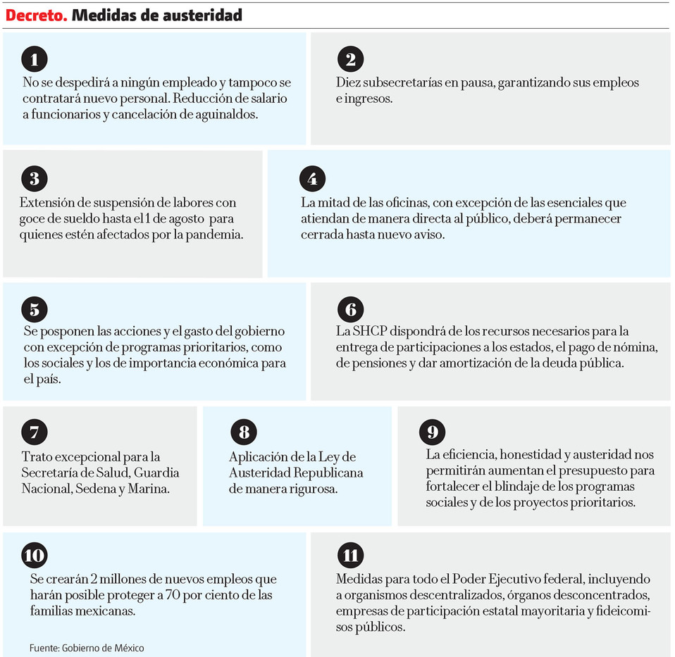 El decreto pospone las acciones y el gasto del gobierno, con excepción de 38 programas y proyectos prioritarios como las pensiones de viejitos y niños con discapacidad, becas a estudiantes, apoyo a madres trabajadoras, tandas, apoyo a pescadores, universidades y escuelas, precios de garantía y Sembrando Vida; mientras que de infraestructura se mantiene el Tren Maya, la refinería de Dos Bocas, el aeropuerto de Santa Lucía, rehabilitación de refinerías y el Tren México-Toluca.