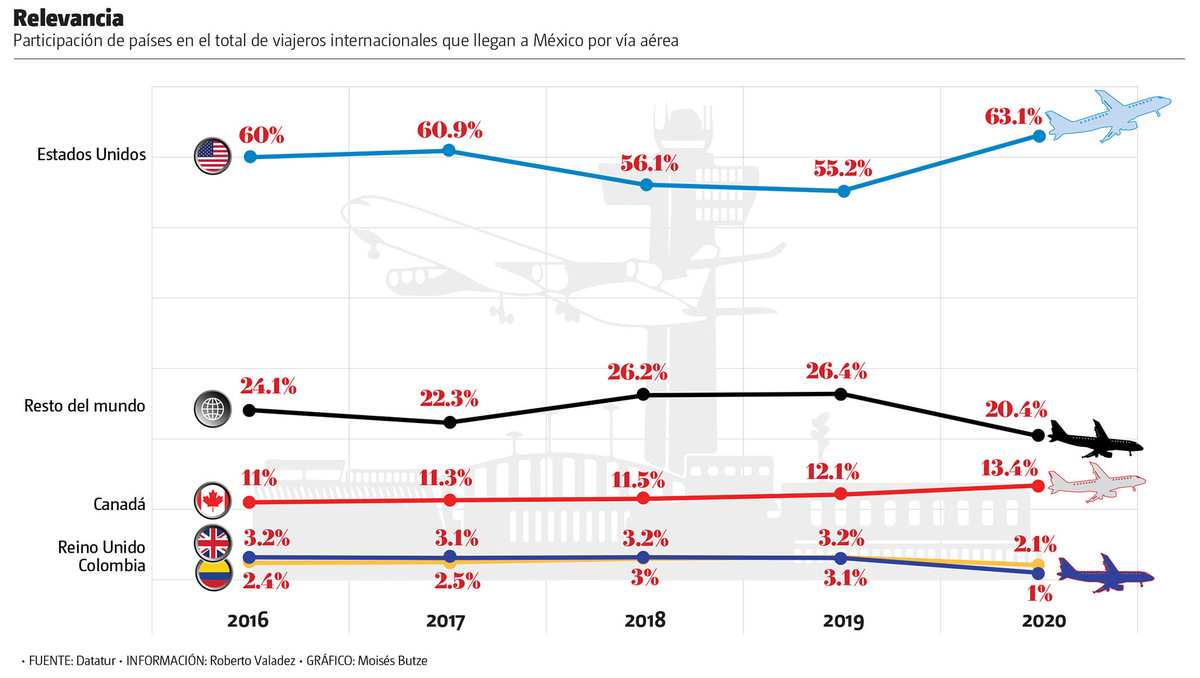 De acuerdo con datos de la Secretaría de Turismo, en 2020 el arribo de canadienses representó 13 por ciento del total de viajeros extranjeros aéreos, mientras que la proporción de EU fue de 63 por ciento.