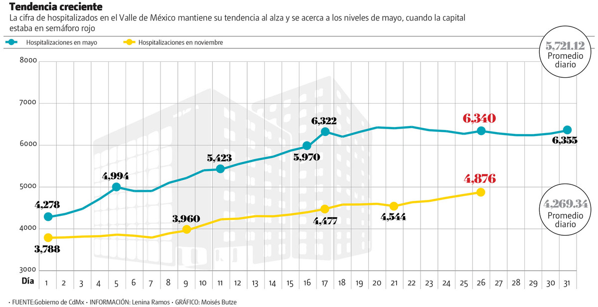 Según datos del gobierno capitalino, el promedio de personas hospitalizadas por covid-19 en noviembre en esta misma región del país fue de 4 mil 269.