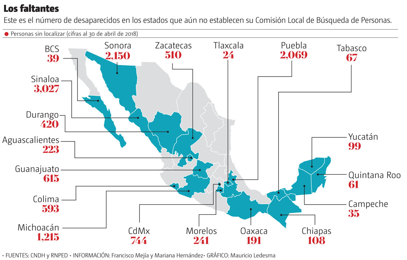 A más de un año de que se emitió la Ley General en Materia de Desaparición Forzada de Personas y de que la cifra de los casos ha crecido, la Comisión Nacional de los Derechos Humanos (CNDH) señaló que 19 entidades “no han establecido su respectiva Comisión Local de Búsqueda”.