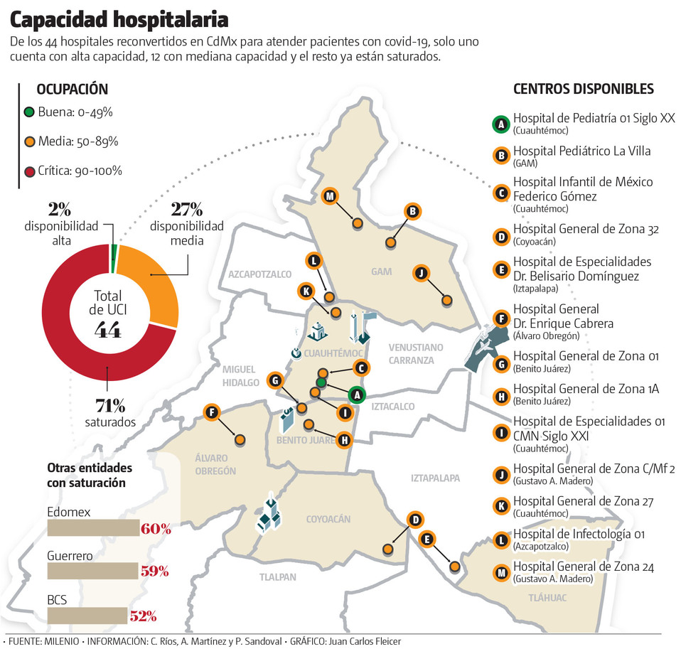 En Ciudad de México solo hay un hospital con buena disponibilidad de camas en las Unidades de Cuidados Intensivos (UCIS) para atender a pacientes con covid-19; de los 44 hospitales destinados a la atención de contagiados, 12 tienen disponibilidad media, uno alta y 31 ya están saturados.