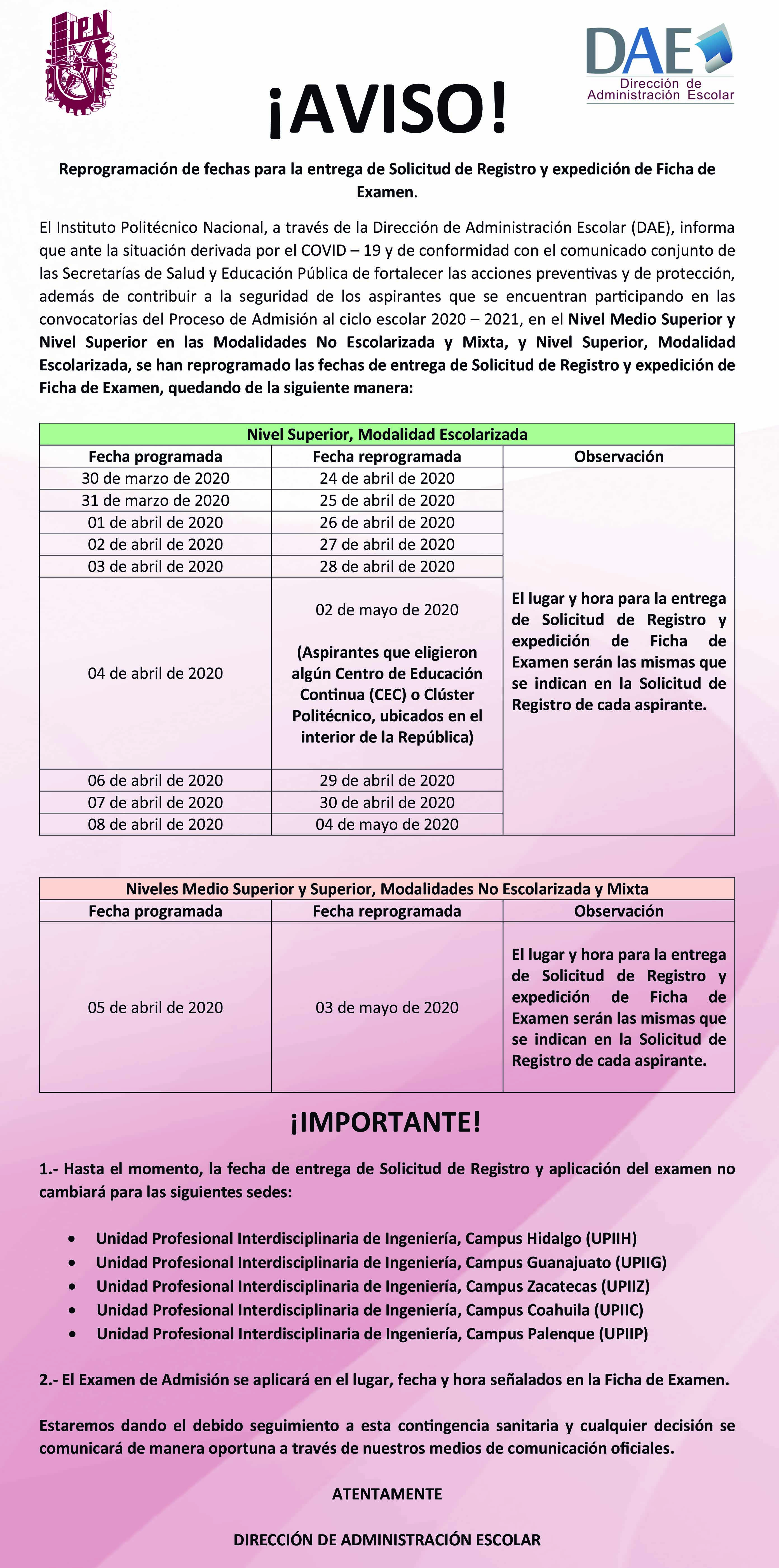 Sin embargo, el IPN informó que hasta el momento, la fecha de entrega de solicitud de registro y aplicación de examen no cambiará para las siguientes sedes: