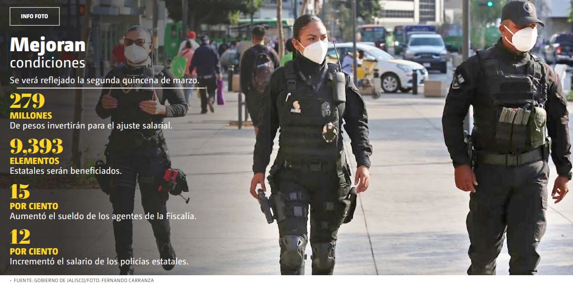 El gobernador de Jalisco Enrique Alfaro Ramírez, anunció un incremento salarial del 12 por ciento a los elementos operativos de la Secretaría de Seguridad y del 15 por ciento a los de la Fiscalía del Estado, siendo el segundo aumento más importante a policías en la última década.