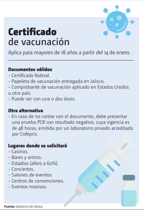 A partir de este viernes 14 de enero, en Jalisco será obligatorio presentar certificado de vacunación anticovid o prueba negativa para entrar a recintos de exposiciones, casinos, antros, estadios y otras actividades, de acuerdo a la información difundida por el gobierno del estado.