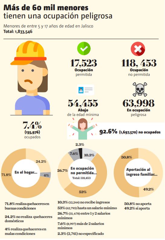 En Jalisco, al menos 181 mil 902 menores de edad tienen que trabajar para ganarse la vida. Entre las herencias de la pandemia se dio un aumento considerable de niñas, niños y adolescentes que tuvieron que sumarse como proveedores o ayudadores domésticos de sus padres, obviamente sin paga y en la mayoría de los casos tuvieron que abandonar sus estudios. Lo anterior, coloca al estado en el lugar ocho de 31 con esta problemática.