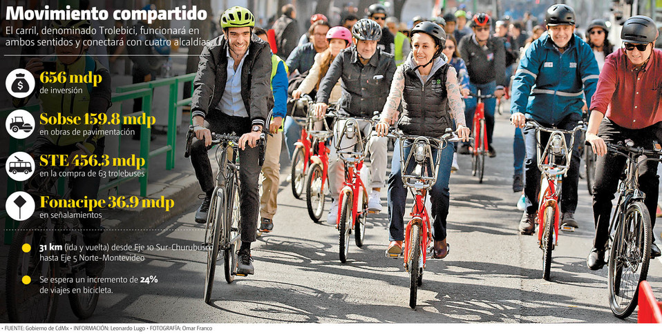 La jefa de Gobierno de Ciudad de México, Claudia Sheinbaum, en compañía del secretario de Movilidad, Andrés Lajous, puso en operación el carril Trolebici que tuvo una inversión de 656 millones de pesos y sobre el cual circularán de manera compartida bicicletas y Trolebuses en ambos sentidos, a lo largo de 31 kilómetros en cuatro alcaldías.