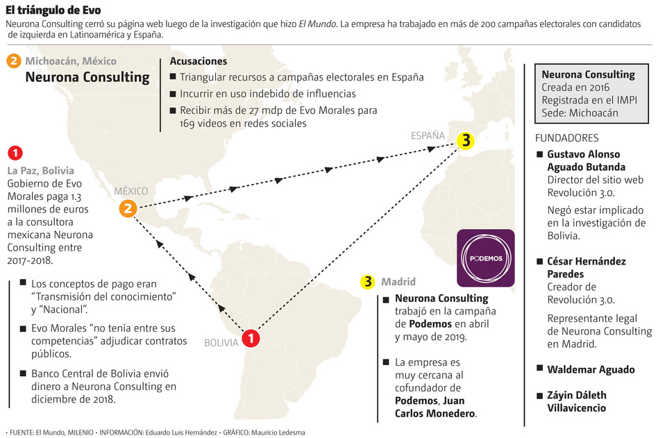 El diario El Mundo publicó que el entonces presidente boliviano Evo Morales pagó 1.3 millones de euros a la consultora mexicana que poco después trabajó con el partido de Iglesias para producir 169 “minivideos” de entre 30 segundos y dos minutos para redes sociales sin concurso público.