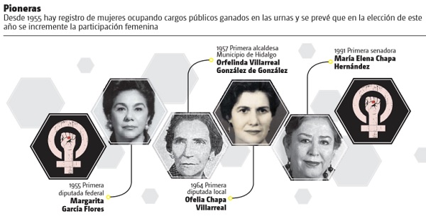 Los liderazgos femeninos en Nuevo León han surgido desde 1955, cuando fue elegida la primera mujer como diputada federal, de ahí, dos años después, en 1957, se tuvo a la primera alcaldesa electa para el municipio de Higueras, lo que trazó el camino para que llegara así en 1964 al Congreso local la primera diputada y fue hasta 1991 cuando se tuvo a la primera senadora.