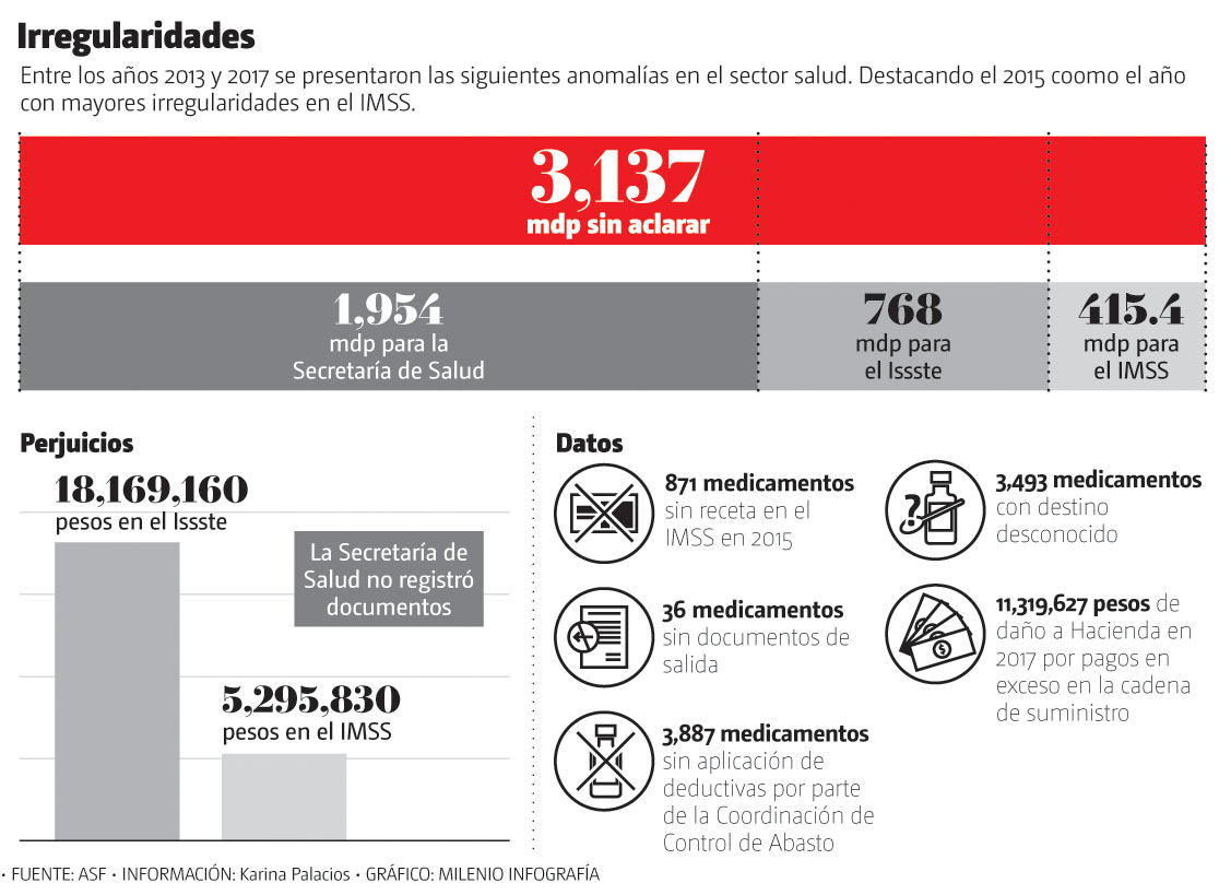 El sexenio de Enrique Peña Nieto cerró con irregularidades cometidas en el sector salud, al no poder aclarar el uso de 3 mil 137 millones de pesos, de estos, mil 954 pertenecen a la Secretaría de Salud, 768 al Instituto de Seguridad y Servicios Sociales de los Trabajadores del Estado (Issste) y 415.4 al Instituto Mexicano del Seguro Social (IMSS).
