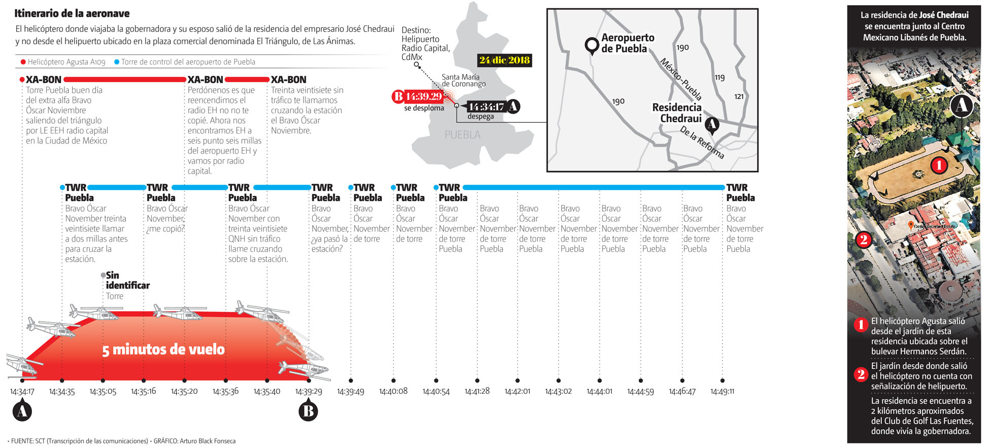 La ruta del piloto incluye salir del aeropuerto de Puebla, dirigirse a la casa privada por la gobernadora y su esposo, y tomar esa misma ruta de regreso rumbo al helipuerto de Las Lomas en Ciudad de México, sobrevolando de nuevo el aeropuerto de Puebla, justamente el punto donde Coppe debió reportarse nuevamente con la cabina.