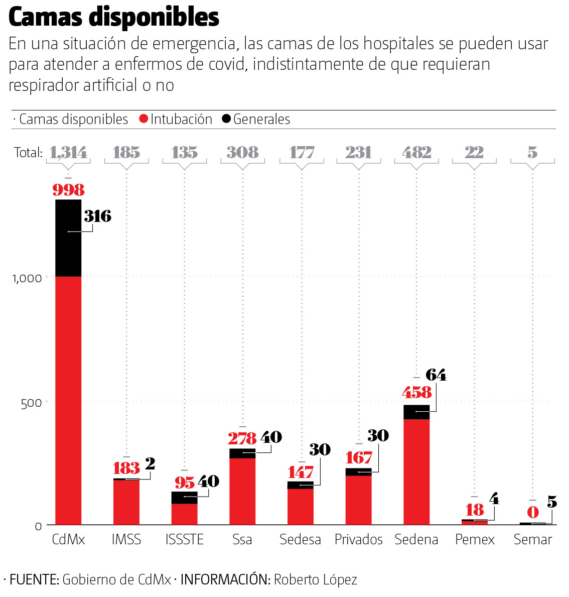 Hasta anoche, cifras oficiales del gobierno capitalino reportaron que, en lo relativo a disponibilidad de camas generales, detrás del IMSS y de la Marina, se encuentra Pemex, con solo 11 camas libres; el Issste, con 88 camas aún no ocupadas; la Secretaría de Salud de la ciudad, con 120; hospitales privados, con 167; la Secretaría de Salud federal, con 275, y la Secretaría de la Defensa, con 436 camas disponibles.