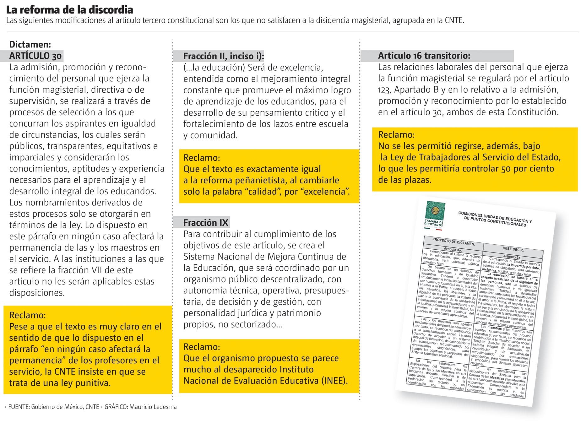 El dictamen consensuado ya por los grupos parlamentarios de Morena, PAN, PRI, MC y PRD incorpora propuestas de los diputados integrantes de la CNTE, pero considera también aspectos como los procesos de selección públicos, transparentes, equitativos e imparciales para la admisión, promoción y reconocimiento del personal docente, en lo que a juicio de los inconformes representa la repetición de las evaluaciones "punitivas".