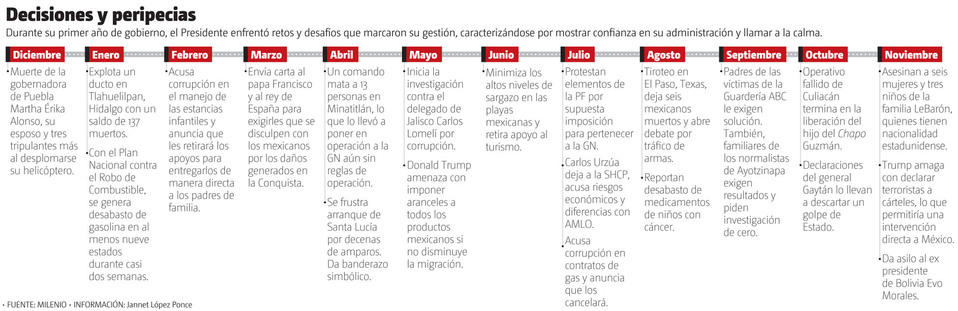 Cada mes en su primer año como titular del Ejecutivo, López Obrador vivió desafíos que marcaron su gobierno y de los que, pese a las expectativas, salió a flote.