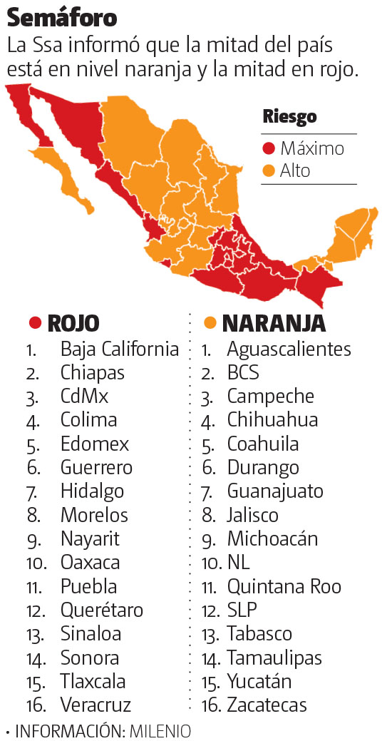 A partir del próximo lunes, 16 estados del país pasarán a semáforo naranja de la emergencia sanitaria, mientras los otros 16 permanecerán en rojo.