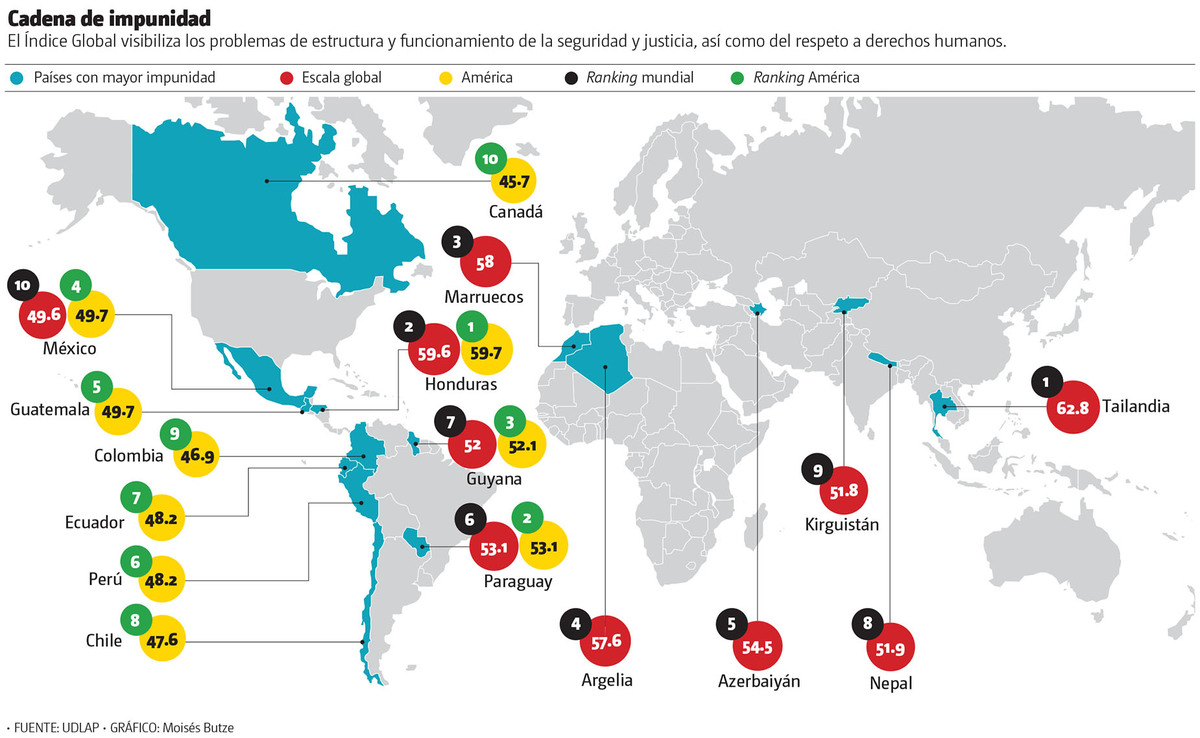 De acuerdo con el ranking, México se ubica en el décimo lugar en la escala global de impunidad, con un valor total de 49.67, de los países estudiados. En la edición de 2017, ocupó el lugar 66 de 69 y hasta 2018 fue el cuarto en el continente americano.