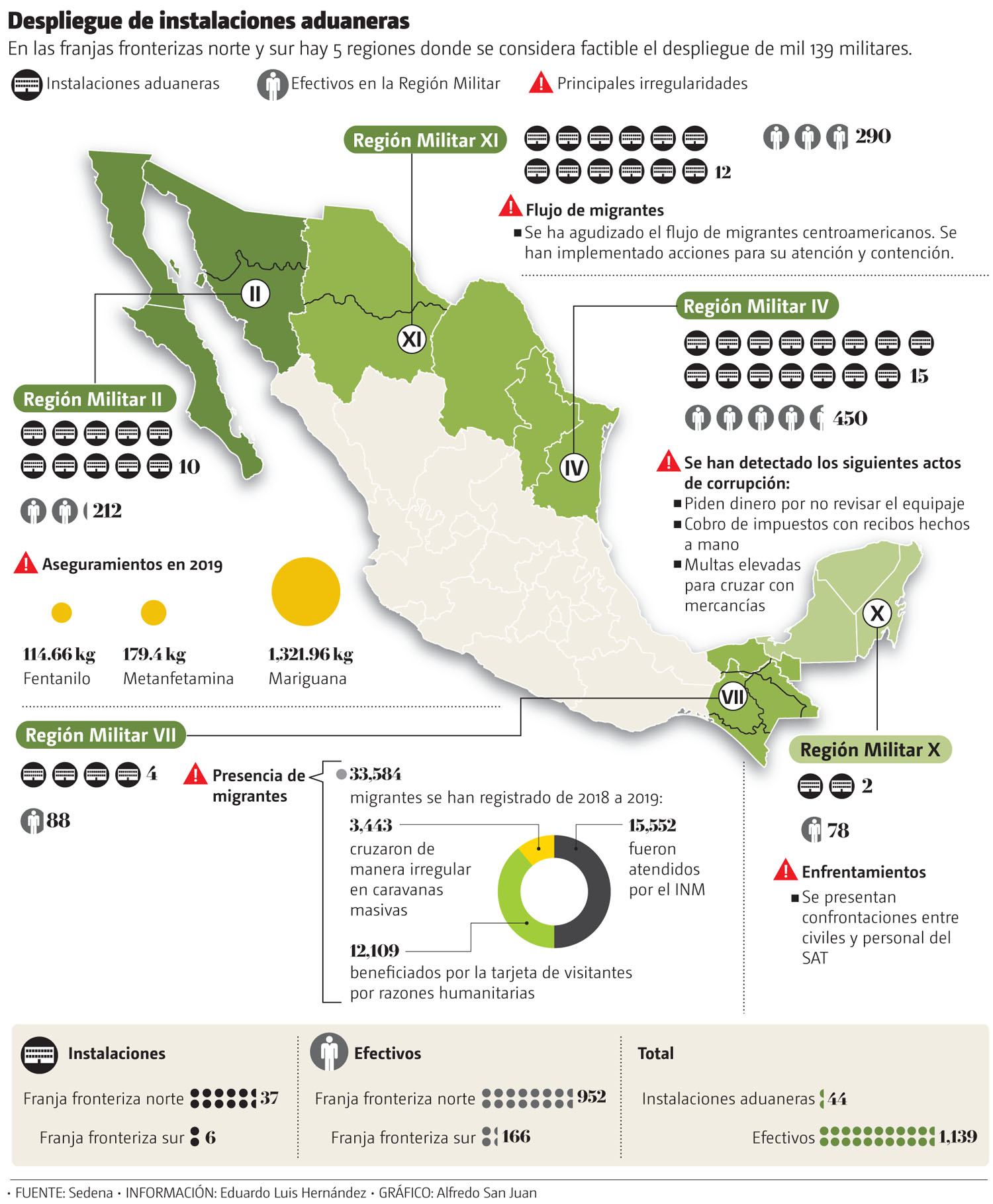 MILENIO tiene en su poder el documento de propuesta en el que se detalla que las instalaciones aduaneras se localizan en dos grandes áreas estratégicas: en la franja fronteriza norte de 3 mil 169 kilómetros con 37 instalaciones y 952 efectivos, y en la franja fronteriza sur con mil 179 kilómetros, seis instalaciones y 166 militares. Además se da seguridad al Centro de Procesamiento de Datos en Querétaro con 21 efectivos.