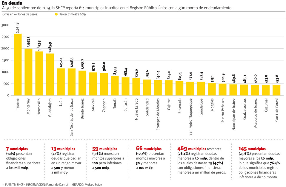 Siete municipios tienen adeudos superiores a mil millones de pesos: Tijuana (2 mil 631 millones), Monterrey (mil 993 millones), Hermosillo (mil 873 millones), Guadalajara (mil 785 millones), León (mil 150 millones), San Nicolás de los Garza (mil 148 millones) y Benito Juárez (Cancún) (mil 55 millones), que en conjunto concentran más de una cuarta parte (28.5 por ciento) del total de las obligaciones financieras de ese orden de gobierno.