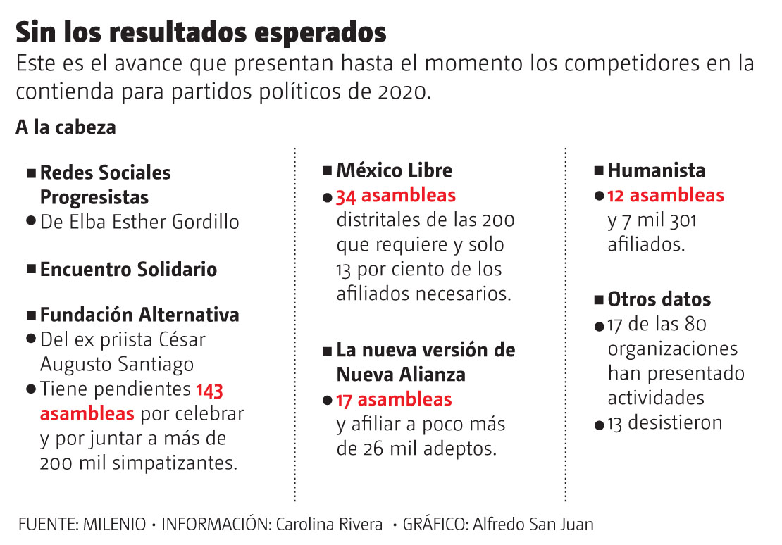 Otra de las organizaciones que parece no despuntar es la nueva versión de Panal, que al perder el apoyo de la ex lideresa magisterial apenas ha logrado celebrar 17 asambleas y afiliar a poco más de 26 mil adeptos.