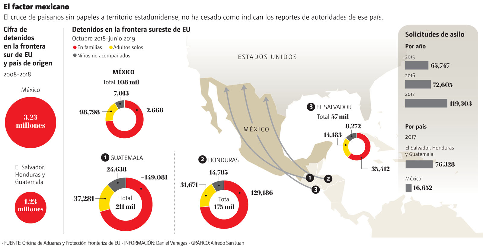Estadísticas de la Patrulla Fronteriza revelan que de 2008 a 2018 fueron detenidos 3 millones 237 mil 529 paisanos indocumentados, cifra muy superior a la de los aprehendidos durante el mismo periodo de El Salvador, Honduras y Guatemala, que juntos sumaron un millón 234 mil 256.