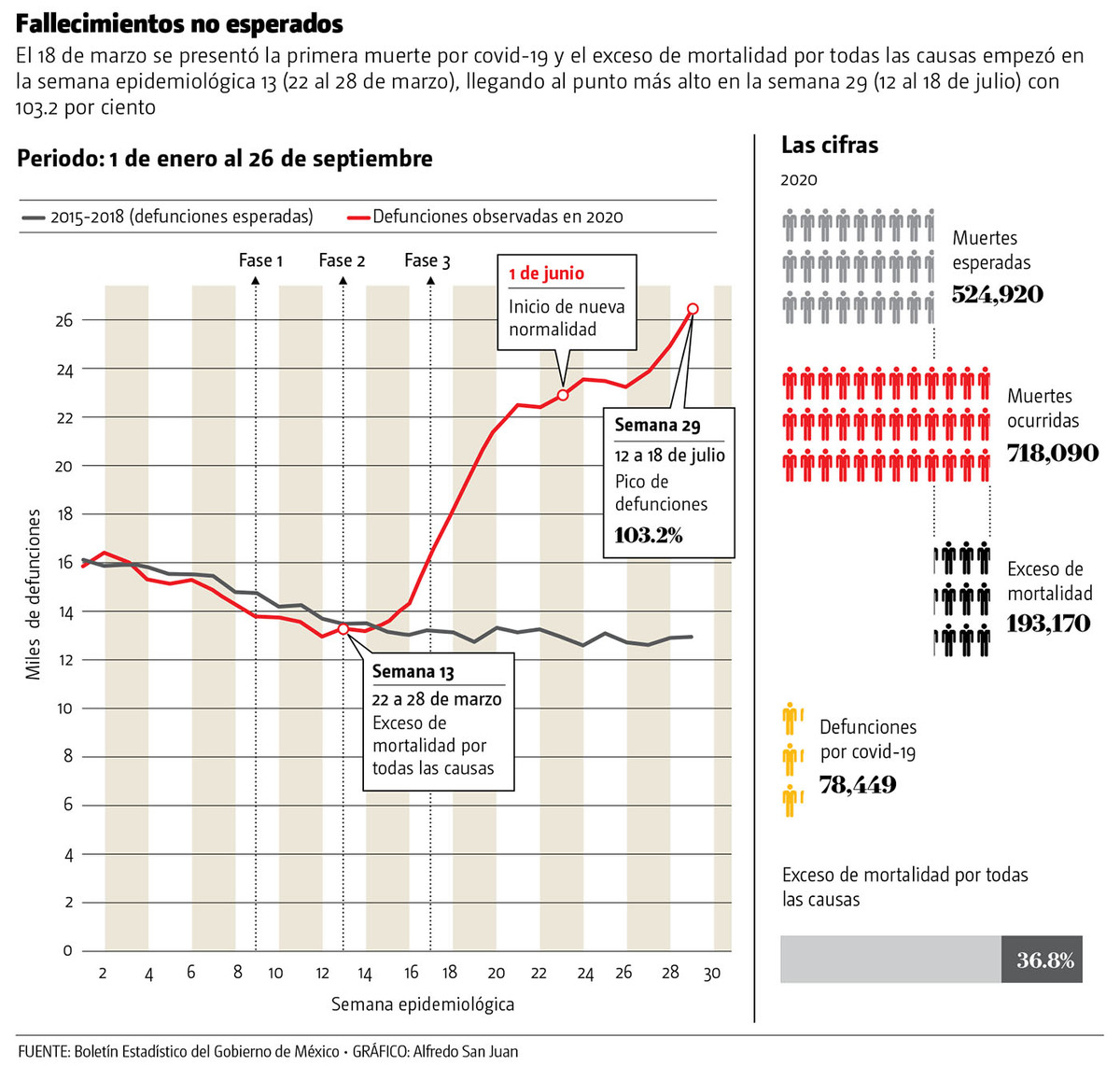 A pesar de que las cifras mostraban un incremento sostenido de los contagios, la reapertura económica y el regreso a la nueva normalidad llegaron en la semana siguiente (30 de mayo al 6 de junio) y en dicho lapso el exceso de fallecimientos se ubicó en 77.3 por ciento.