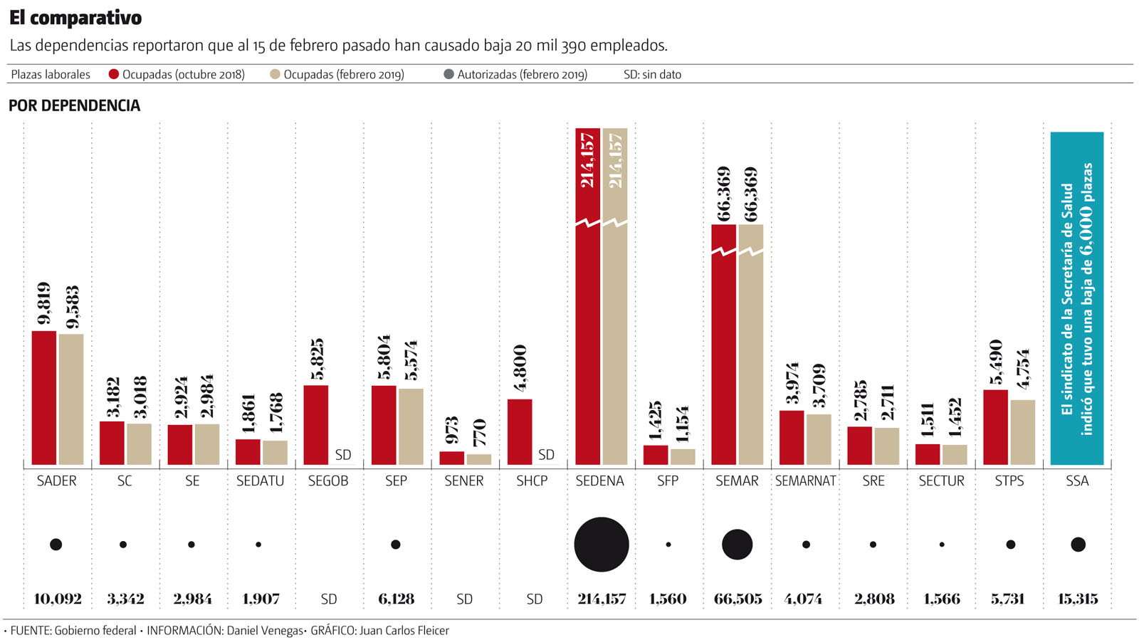 En tanto, las secretarías de Hacienda y de Gobernación solo reportaron el número de plazas ocupadas en octubre: 4 mil 800 en el caso de la primera y 5 mil 835 en el caso de la segunda, pero no ofrecieron la actualización para febrero de este año, por lo que para este recuento se consideró que esta cifra se mantiene sin cambios.