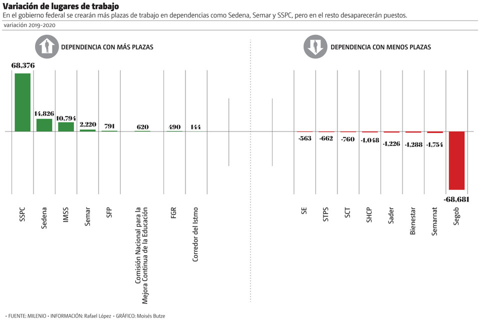 Según el paquete económico 2020, solo aumentará el número de plazas en nueve dependencias federales, entre éstas Sedena, Marina e IMSS, mientras que se reducirán en 21.