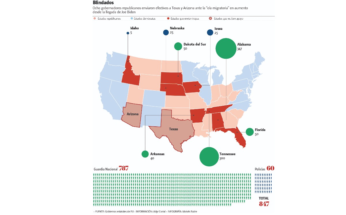 Alabama, Arkansas, Dakota del Sur, Florida, Idaho, Iowa, Nebraska y Tennessee contribuyen con personal armado para ayudar a las tareas de reforzamiento en la seguridad fronteriza de Texas y Arizona.