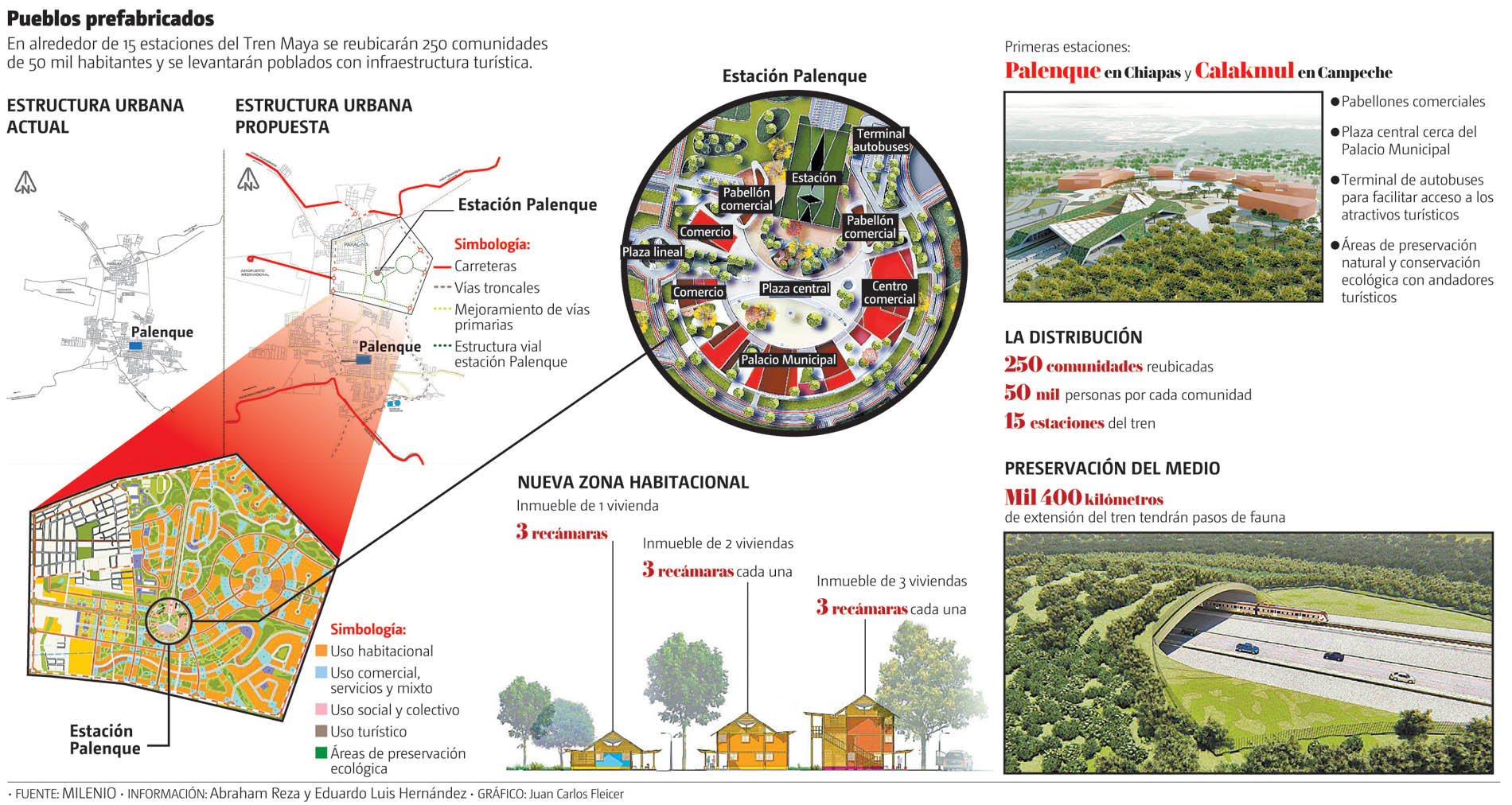 Para lograrlo, el Fonatur prevé construir viviendas, comercios, parques lineales, puentes de fauna y hasta modificar carreteras aledañas a cada terminal, pero también lo que será la sede del palacio municipal.