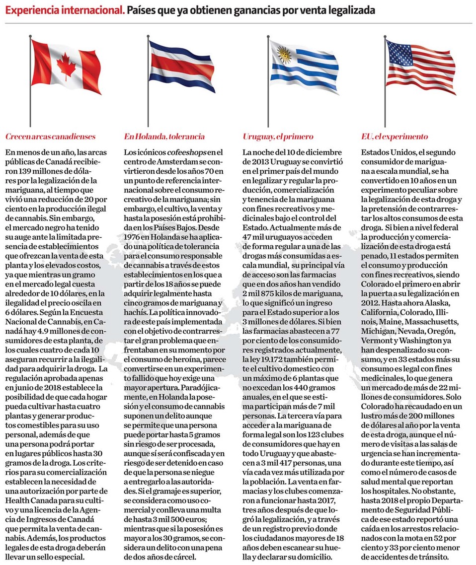 En menos de un año, las arcas públicas de Canadá recibieron 139 millones de dólares por la legalización de la mariguana, al tiempo que vivió una reducción de 20 por ciento en la producción ilegal de cannabis. Sin embargo, el mercado negro ha tenido su auge ante la limitada presencia de establecimientos que ofrezcan la venta de esta planta y los elevados costos, ya que mientras un gramo en el mercado legal cuesta alrededor de 10 dólares, en la ilegalidad el precio oscila en 6 dólares. Según la Encuesta Nacional de Cannabis, en Canadá hay 4.9 millones de consumidores de esta planta, de los cuales cuatro de cada 10 aseguran recurrir a la ilegalidad para adquirir la droga. La regulación aprobada apenas en junio de 2018 establece la posibilidad de que cada hogar pueda cultivar hasta cuatro plantas y generar productos comestibles para su uso personal, además de que una persona podrá portar en lugares públicos hasta 30 gramos de la droga. Los criterios para su comercialización establecen la necesidad de una autorización por parte de Health Canada para su cultivo y una licencia de la Agencia de Ingresos de Canadá que permita la venta de cannabis. Además, los productos legales de esta droga deberán llevar un sello especial.
