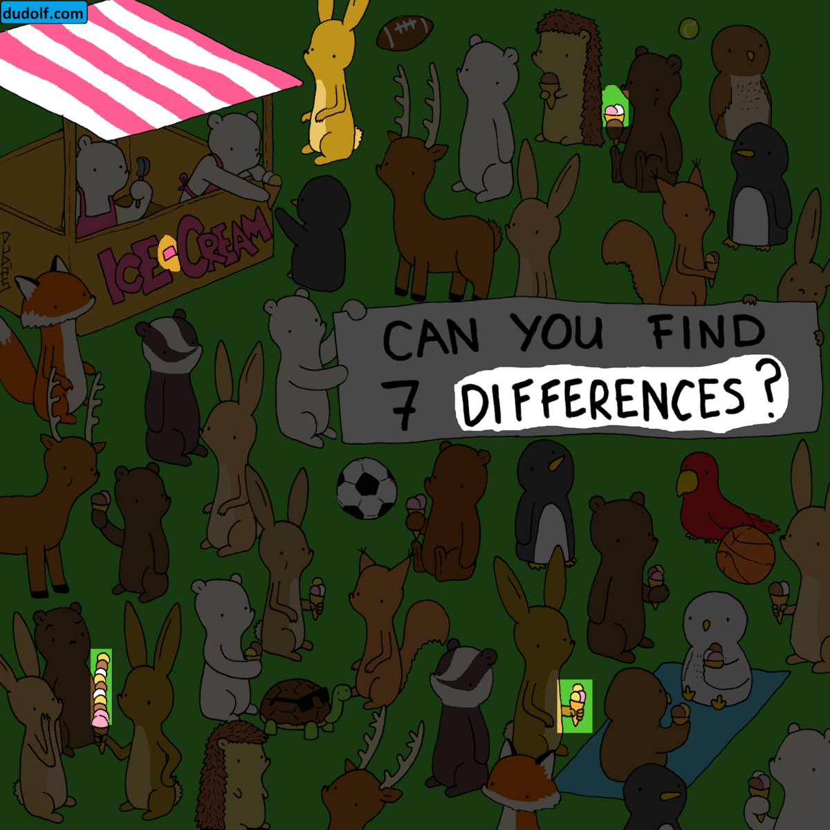 Sin embargo, tenemos una segunda ilustración, la cual cuenta con siete diferencias. Incluso, observamos un cartel sostenido por un oso y un conejo, que nos plantea el desafío. ¿Podrás completarlo?