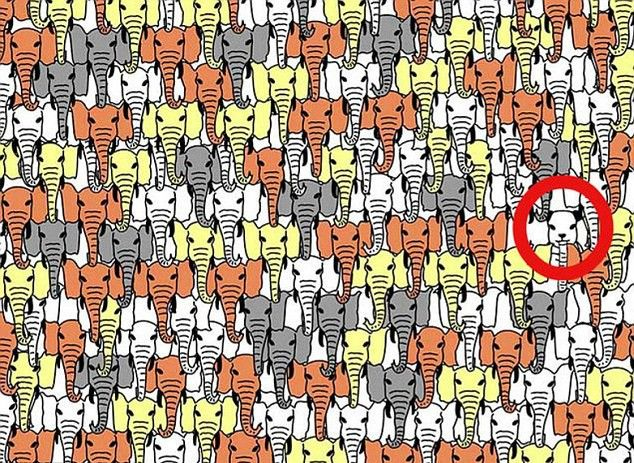 En esta ocasión, habrás notado que tenemos una confusa imagen, si te fijas bien, está llena de elefantes de diferentes colores: café, amarillo, gris, blanco... ¿Qué debes hacer? Encontrar un intrépido oso panda escondido entre todos esos elefantes. ¿Estás listo? Quizás quieras ir por tus lentes para afinar tu vista o parpadear un poco para que tus ojos estén listos, pues deberás hacerlo en tan sólo unos segundos. La solución estará al final si lo necesitas.