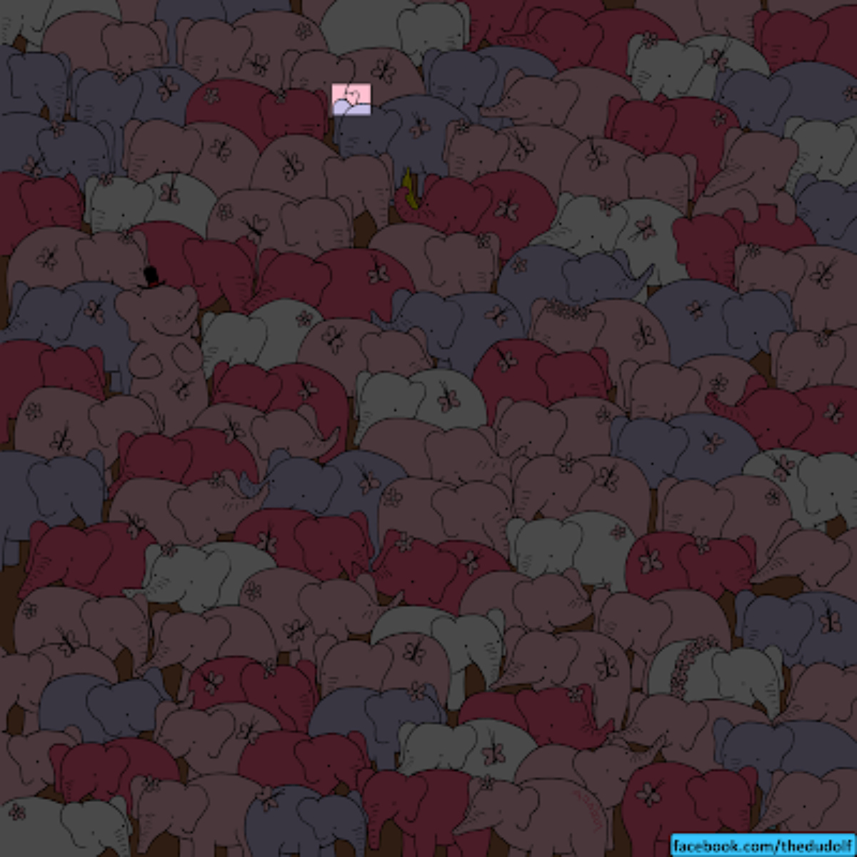 En esta ocasión tendrás que poner toda la atención posible, pues no será nada sencillo encontrar un pequeño corazón entre un montón de elefantes rosas, morados, violetas y blancos. ¿Preparado? Te desafiamos a realizarlo en sólo 20 segundos. A continuación te presentamos la imagen completa y te deseamos éxito.