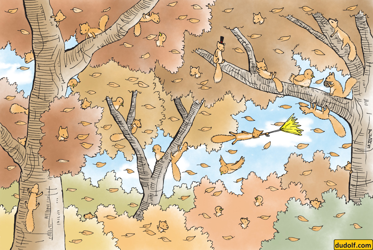 El reto visual de hoy no será fácil, pues tendremos que buscar un montón de ardillas escondidas entre árboles con sus hojas completamente secas en una imagen del ilustrador Dudolf. Están trepadas por todos lados, algunas de ellas se encuentran a la vista y contrastan con el cielo azul; sin embargo, muchas otras serán complicadas de encontrar e incluso, hay varios obstáculos visuales.