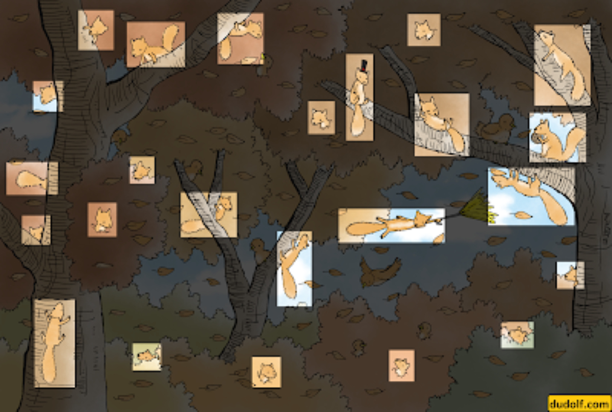 Puedes ver la imagen más grande aquí. Fácil, ¿no es así? Si necesitas una pista: hay una ardilla de la que sólo se ve su cola en el árbol del lado izquierdo, y quizás no la contaste. En total, hay 24 ardillas, ten mucho cuidado de no confundirlas con los pájaros. Si no las encontraste, te damos 15 segundos más para que lo vuelvas a intentar... si no lo lograste, puedes ver la solución un poco más abajo.